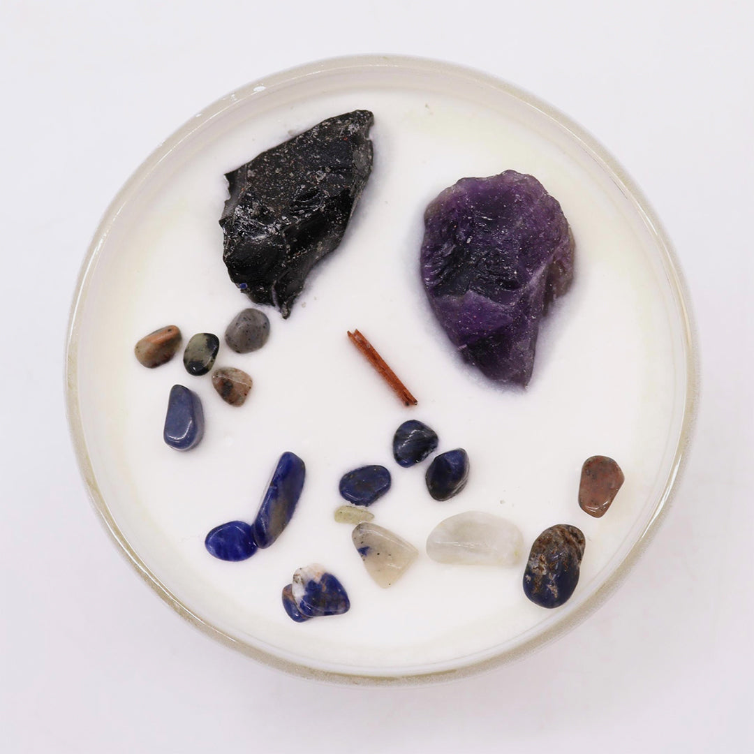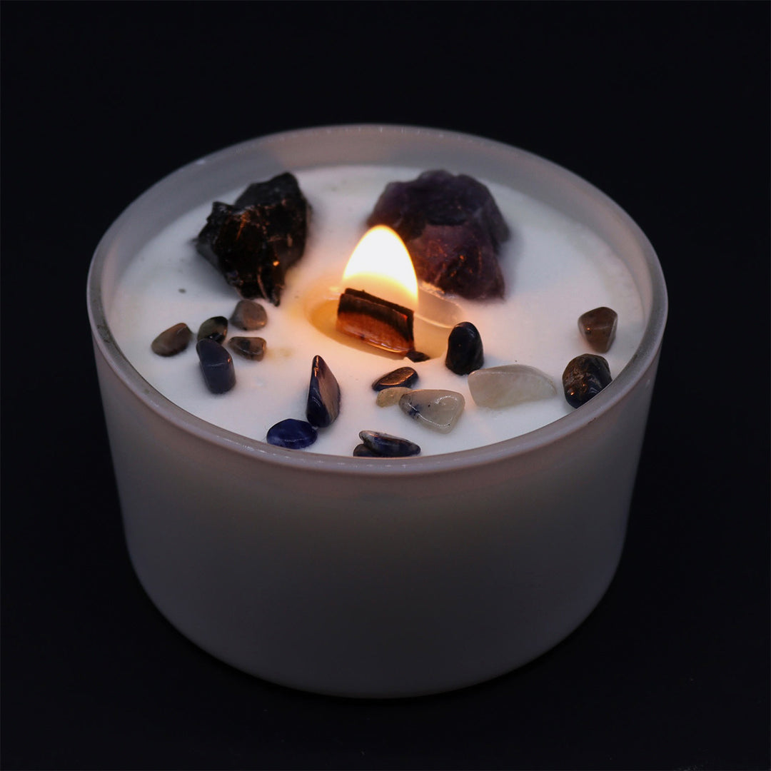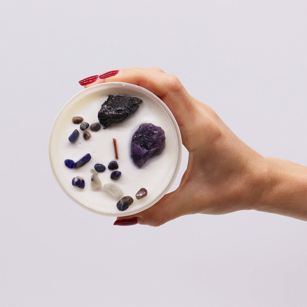 Realizzate con vere pietre semipreziose, cera di soia naturale, fragranza e stoppini di legno.