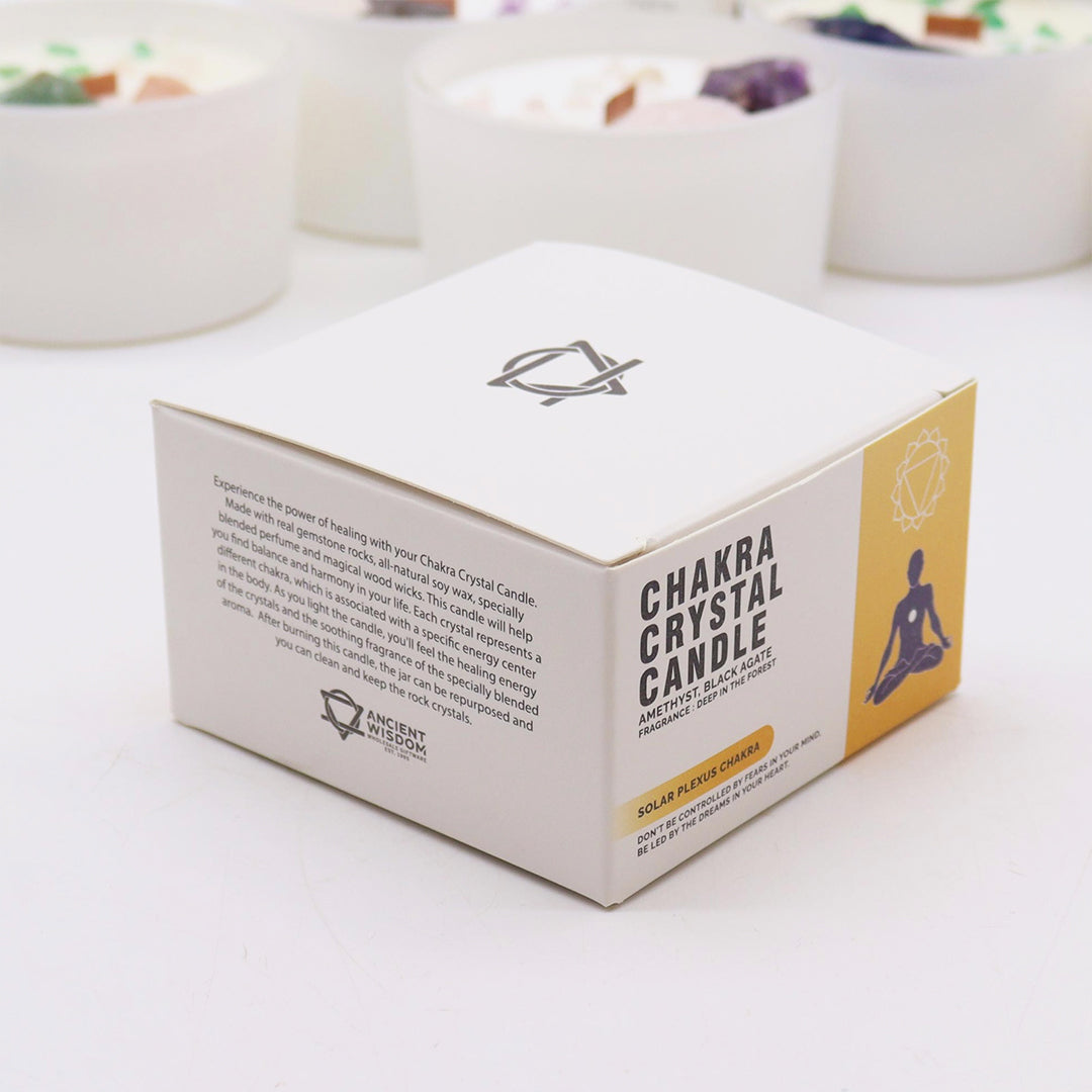 Migliora il tuo potere personale e la tua autostima con la nostra straordinaria candela cristallo chakra del plesso solare. La candela è infusa con l'energia dell'ametista e dell'agata nera, rappresentando così in modo autentico l'essenza del chakra del plesso solare. La candela è infusa con la fragranza "Deep in the Forest" che evoca il coraggio e la sicurezza di sé, invitandoti a esplorare il tuo potenziale interiore con fiducia. La candela è contenuta in una scatola che condivide un messaggio di incoraggiamento: "Non lasciarti controllare dalle paure nella tua mente, lasciati guidare dai sogni nel tuo cuore". Accendi questa candela per potenziare la tua autostima, attingere alla tua forza interiore e diffondere una radiante fiducia in te stesso.