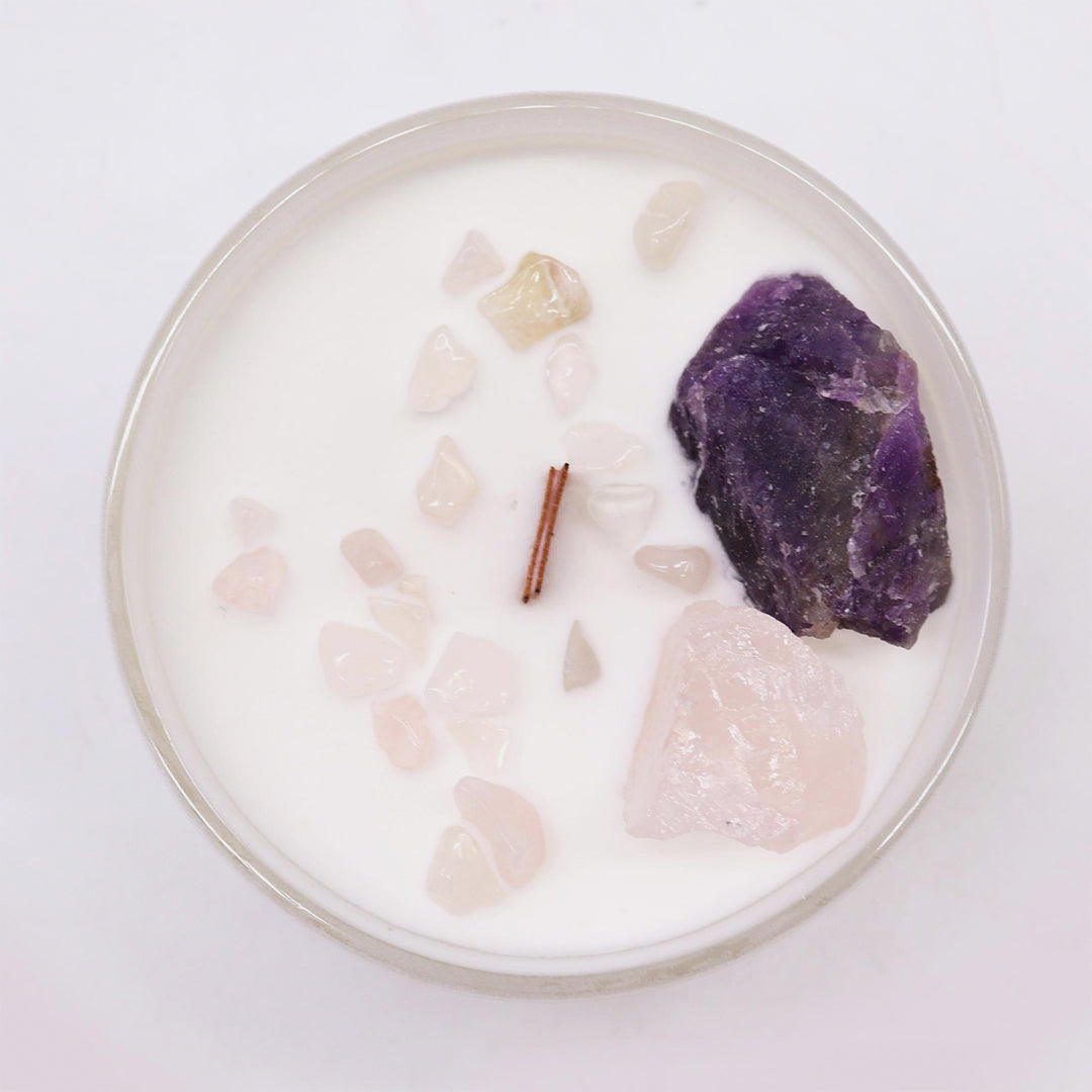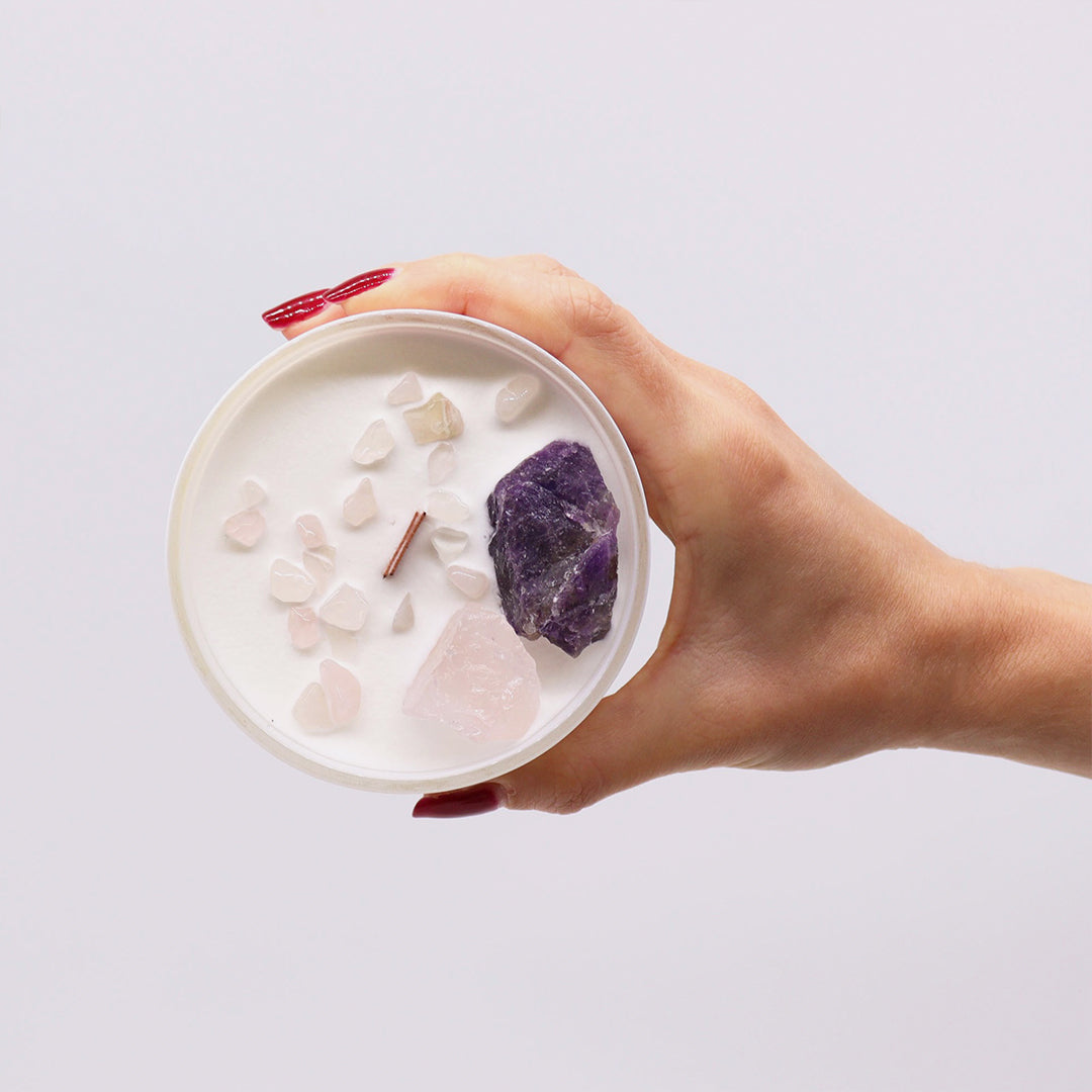 Realizzate con vere pietre semipreziose, cera di soia naturale, fragranza e stoppini di legno.