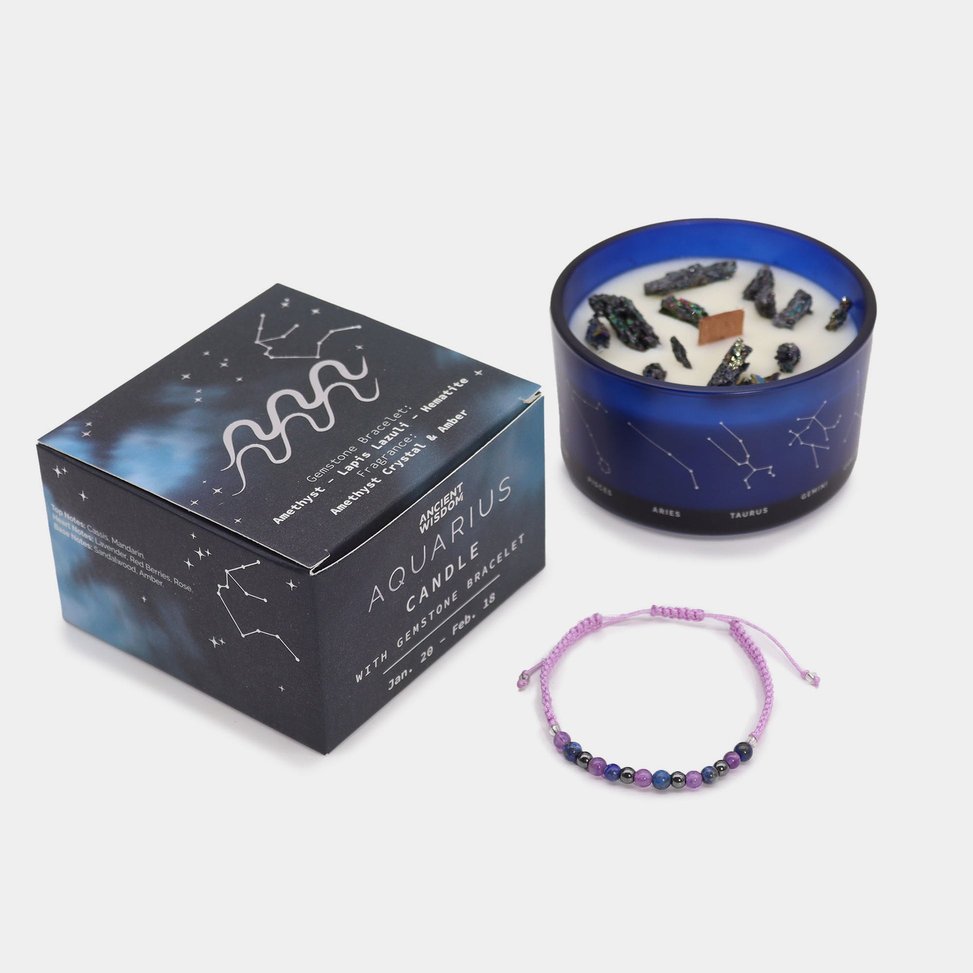 Celebra lo spirito visionario dell’Acquario con questa candela dello Zodiaco arricchita da un braccialetto. Infusa con le note rilassanti di ametista e ambra, diffonde un’atmosfera di serenità e ispirazione. Durante la combustione, rivela scintillanti gemme nascoste, amplificando il legame con l’energia unica dell’Acquario.